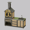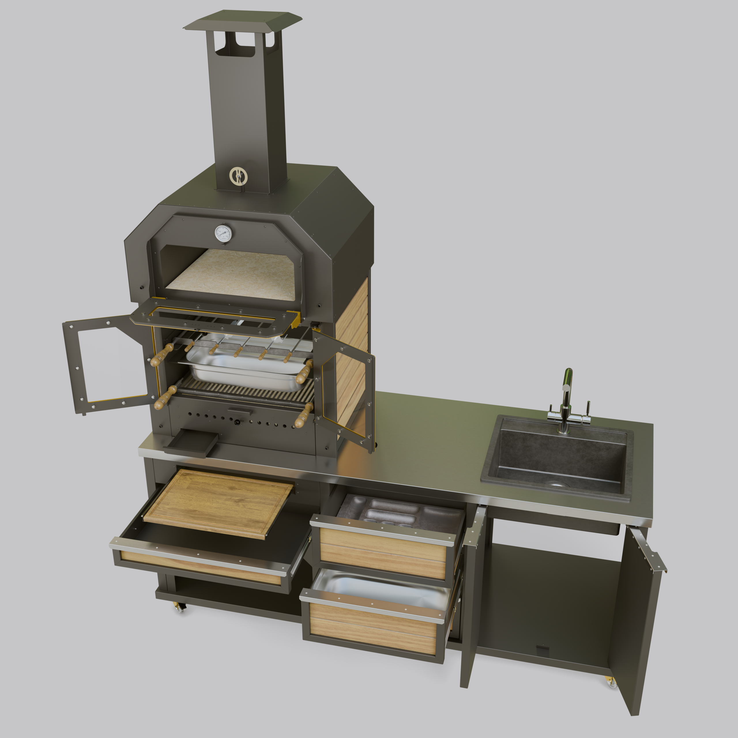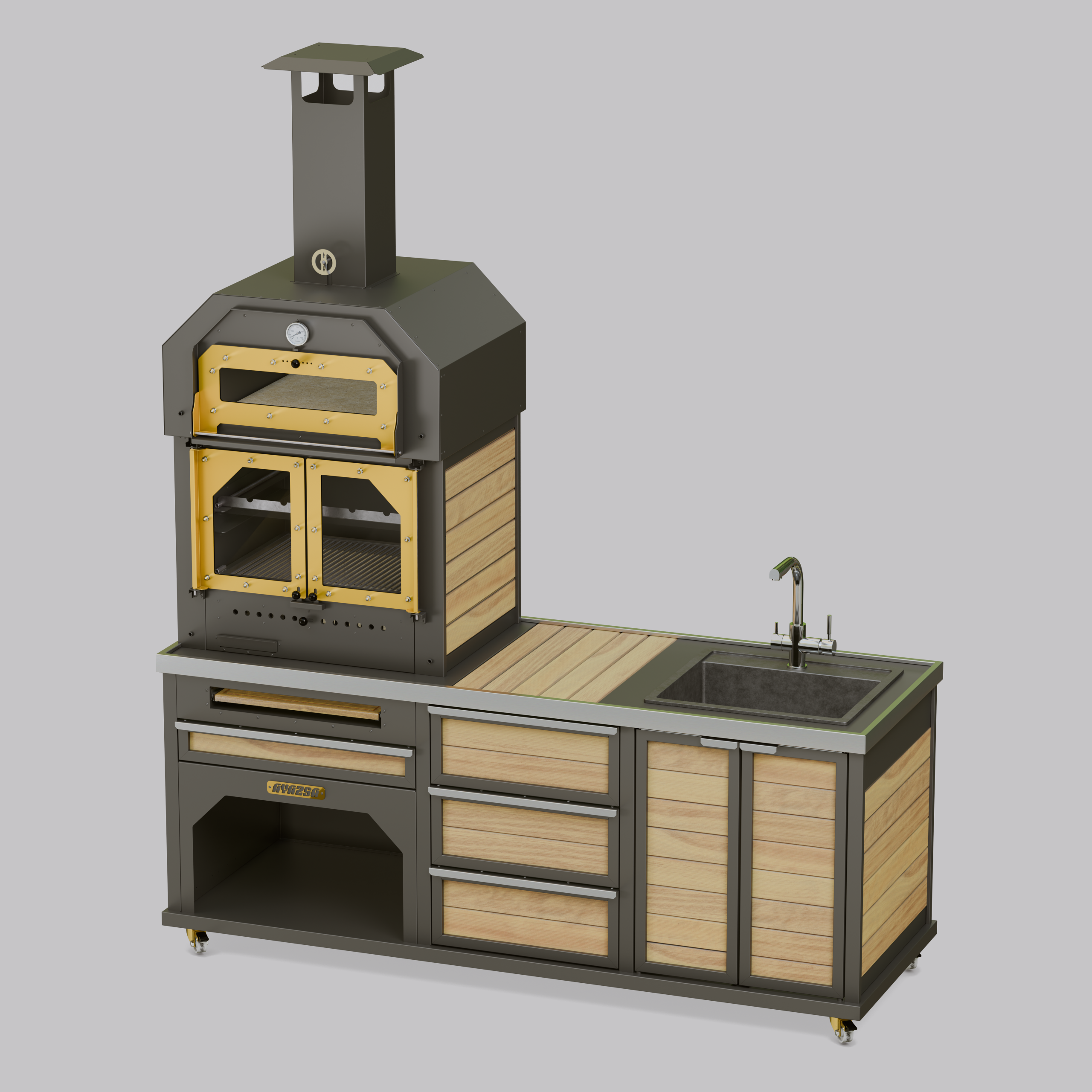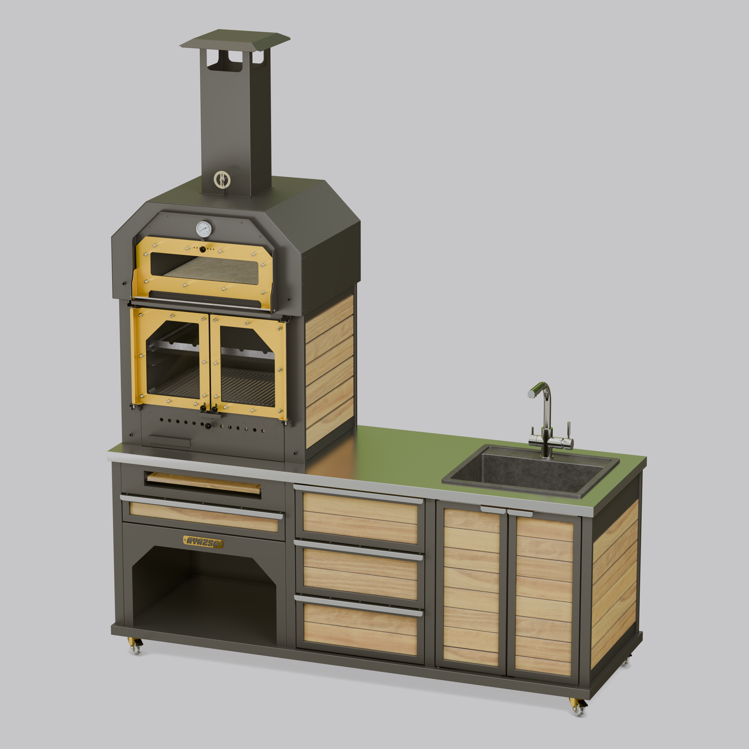 Tezgah bölümü granit evyeli tek çekmeceli ve üçlü blok çekmeceli, et kesme tahtalı, odunluklu ve çift çarpma kapılı.