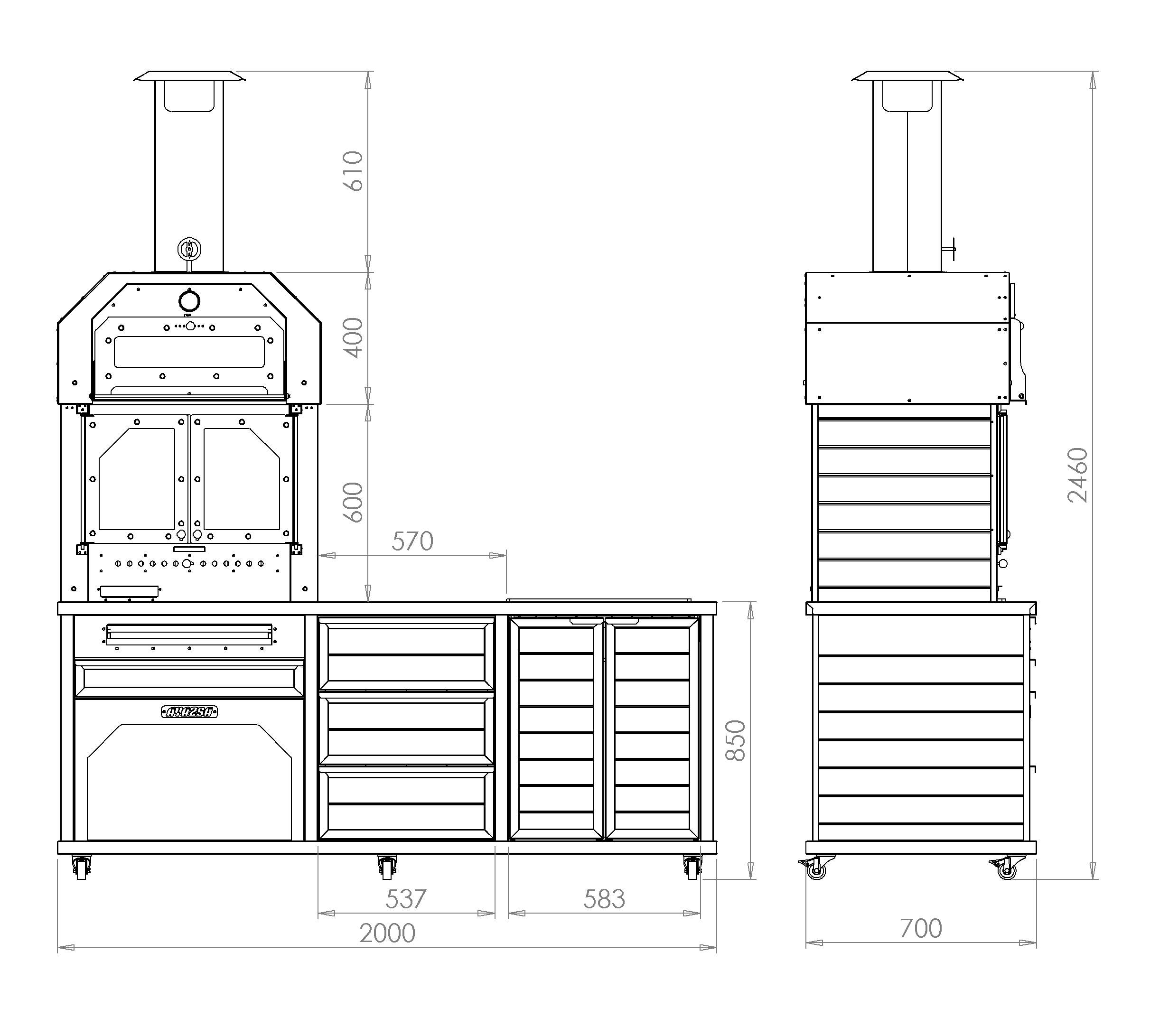 Izgara bölümü çift cidarlı, ısı izolasyonlu ve ateş tuğlalı.